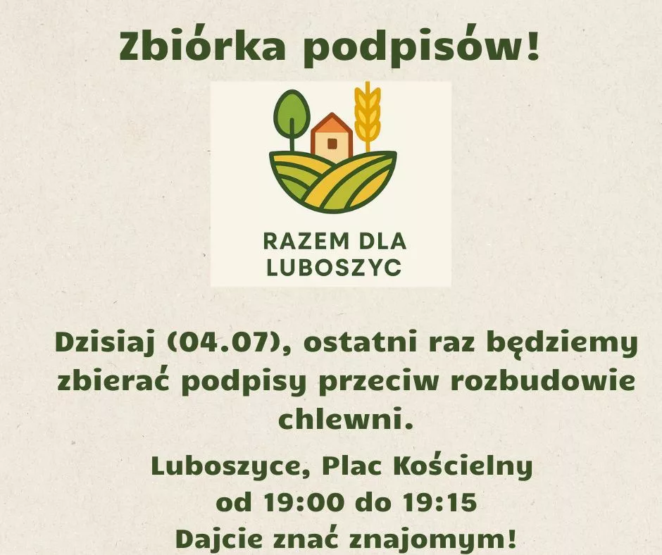 Dziś po raz ostatni będziemy zbierać podpisy pod petycją przeciwko rozbudowie chlewni w Luboszycach.